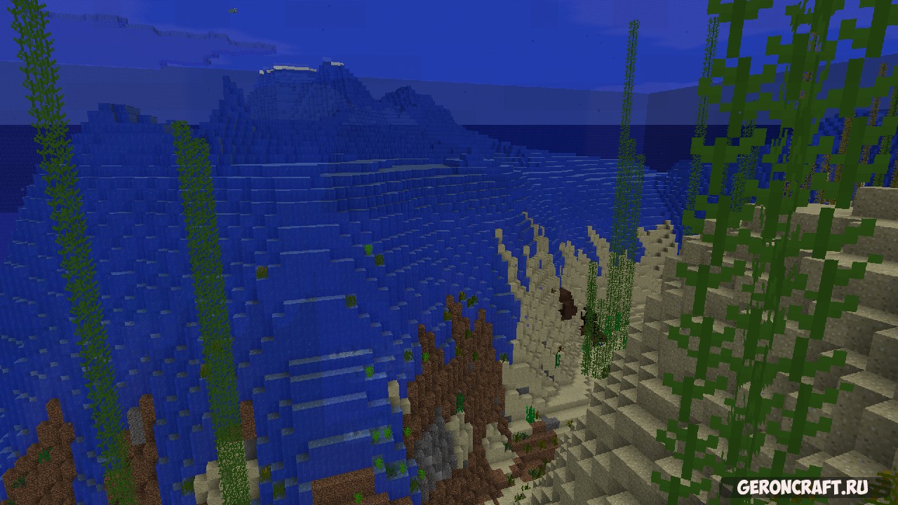 Эта карта использует управление ландшафтом для создания подводного мира с пользовательскими биомами. Этот мир был создан для уменьшения задержки при создании новых кусков. Используйте этот мир в качестве шаблона для всех миров выживания в Подводных глубинах.