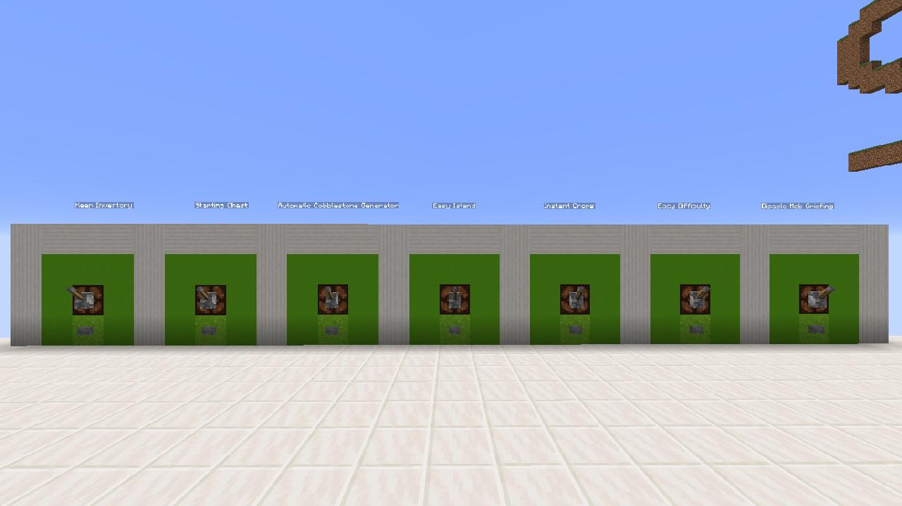 Вы можете включить три категории настроек. Они легкие, сложные и обширные. Легкая категория помогает новым игрокам или помогает вам быстрее выполнять задачи. Например, если вам не нравится добыча булыжника в течение длительного периода времени, вы можете включить автоматический генератор булыжника, чтобы помочь вам. Сложная категория пытается усложнить игру, например, добавив опцию «Не прыгать». Экспансивная категория дает вам больше возможностей. С помощью этих опций вы можете добавить до трех островов, например, остров из руд.