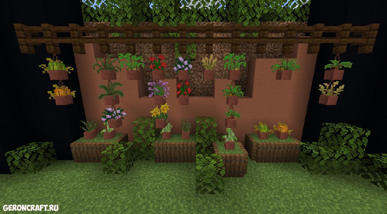 Цветочные горшки можно повесить практически на каждом блоке, даже на себя! Это позволяет вам создавать великолепные декоративные элементы с использованием разных видов цветочных горшков!