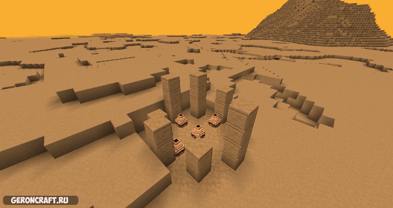 Измерение пустыни Руины, содержащие горшки с добычей Кобальтовая руда (+ инструменты и броня) Пещеры и паутины (с пещерными пауками) Структура портала над миром Событие солнечной вспышки (вспышки поразят мир вам лучше спрятаться под землей) Нестандартная музыка 1 трек (мной!) Немного отставание Разнообразные эксклюзивные биомы Засушливые квартиры Арид Пикс Валунное поле Высушенное озеро Spikelands Оазис (и берег)