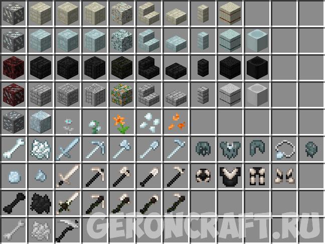 Обычные, блуждающие, увядающие и пустотелые кирпичи изготавливаются с использованием кости блоки. Также добавляются блоки блуждающих, увядающих и пустых костей.