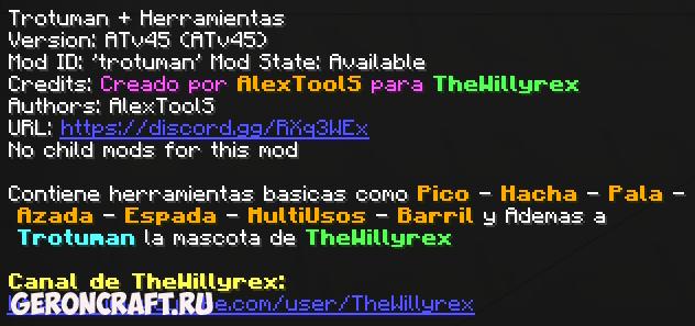 Это хорошо проработанный мод с Trotuman, официальным талисманом TheWillyrex и базовых инструментов, таких как Меч — Кирка — Топор — Лопата — Мотыга и многоцелевое использование (Кирка / Лопата / Топор) Тротуман появляется в биоме Болота …